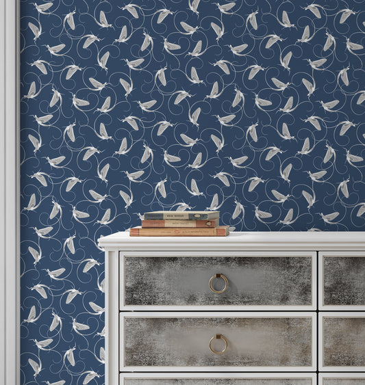 Dance Of The Mayfly Grey on Navy Wallpaper