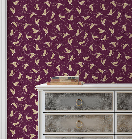 Dance Of The Mayfly Soft Ochre on Aubergine Wallpaper