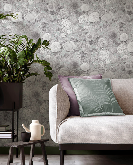 Floribunda Pewter on Duckegg Wallpaper