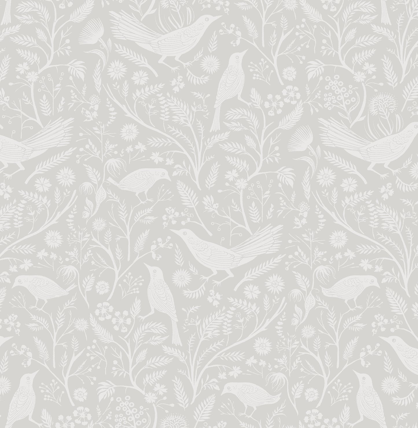 A charming folk art inspired composition of woodland birds and wildflowers in a naive style.