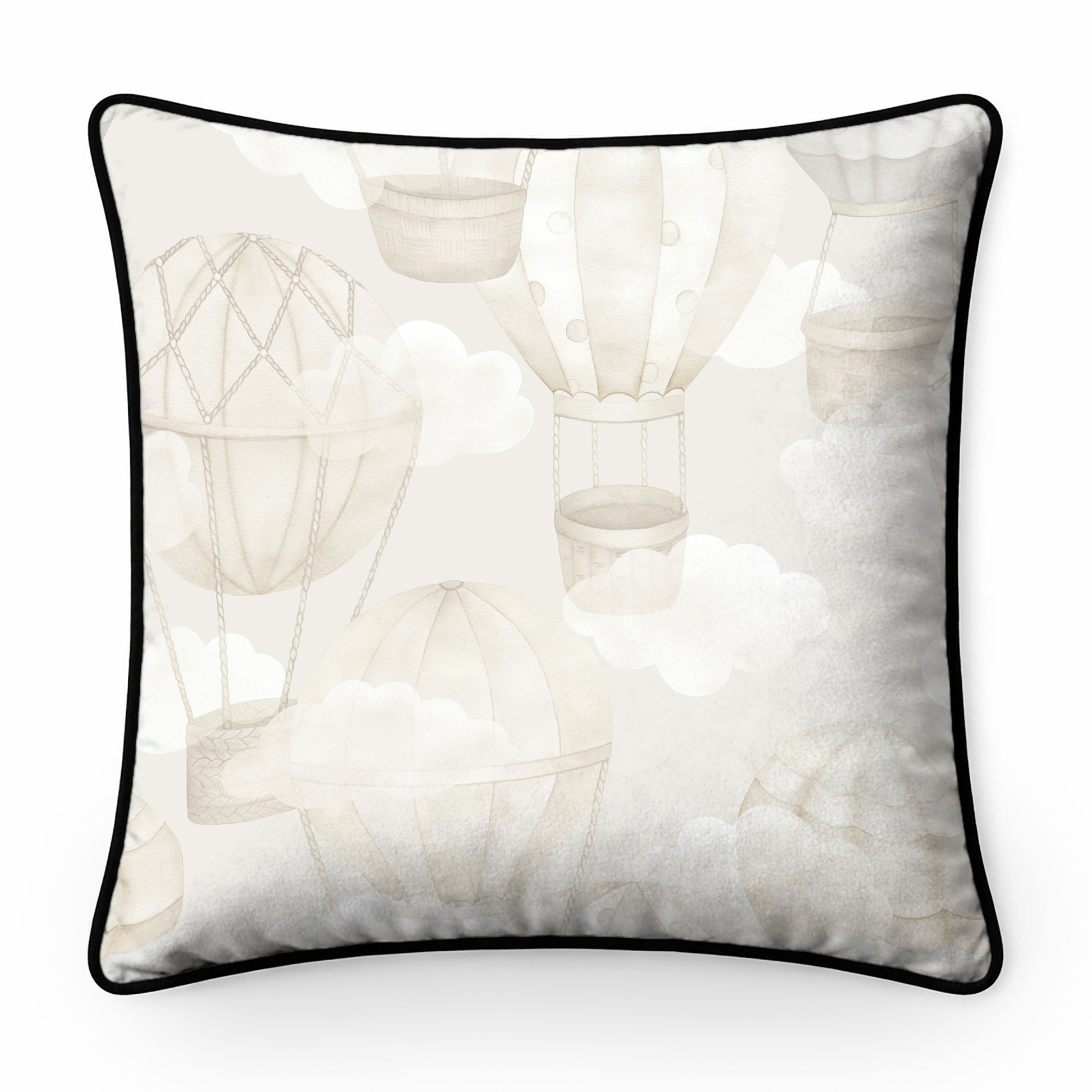 A WHIMSICAL WATERCOLOUR PATTERN FEATURING HOT AIR BALLOONS FLOATING THROUGH FLUFFY CLOUDS. LET YOUR LITTLE AERONAUTS DRIFT GENTLY OFF TO SLEEP WITH THIS PERFECT NURSERY CUSHION.