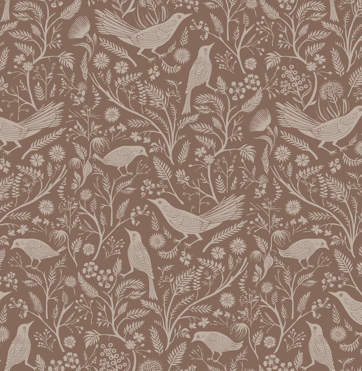 A charming folk art inspired composition of woodland birds and wildflowers in a naive style.