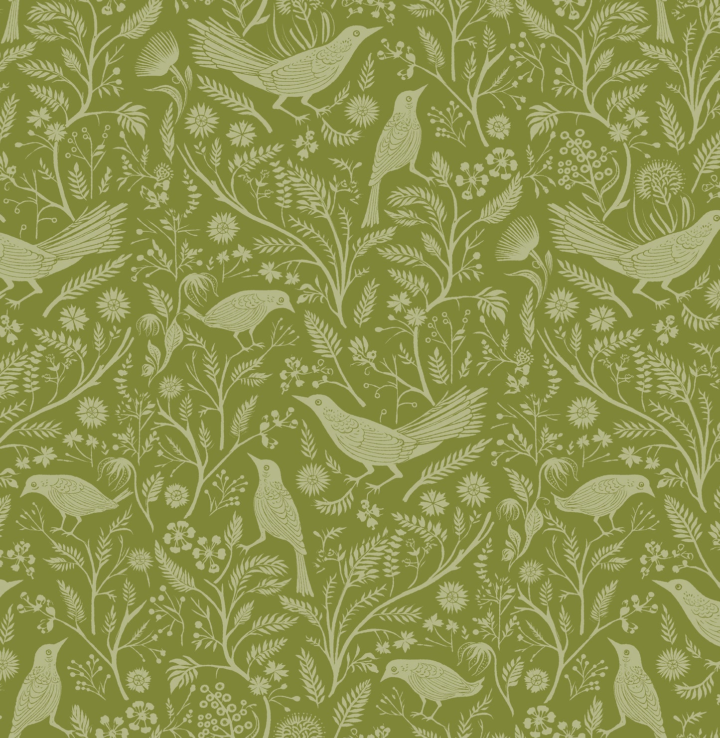 A charming folk art inspired composition of woodland birds and wildflowers in a naive style.