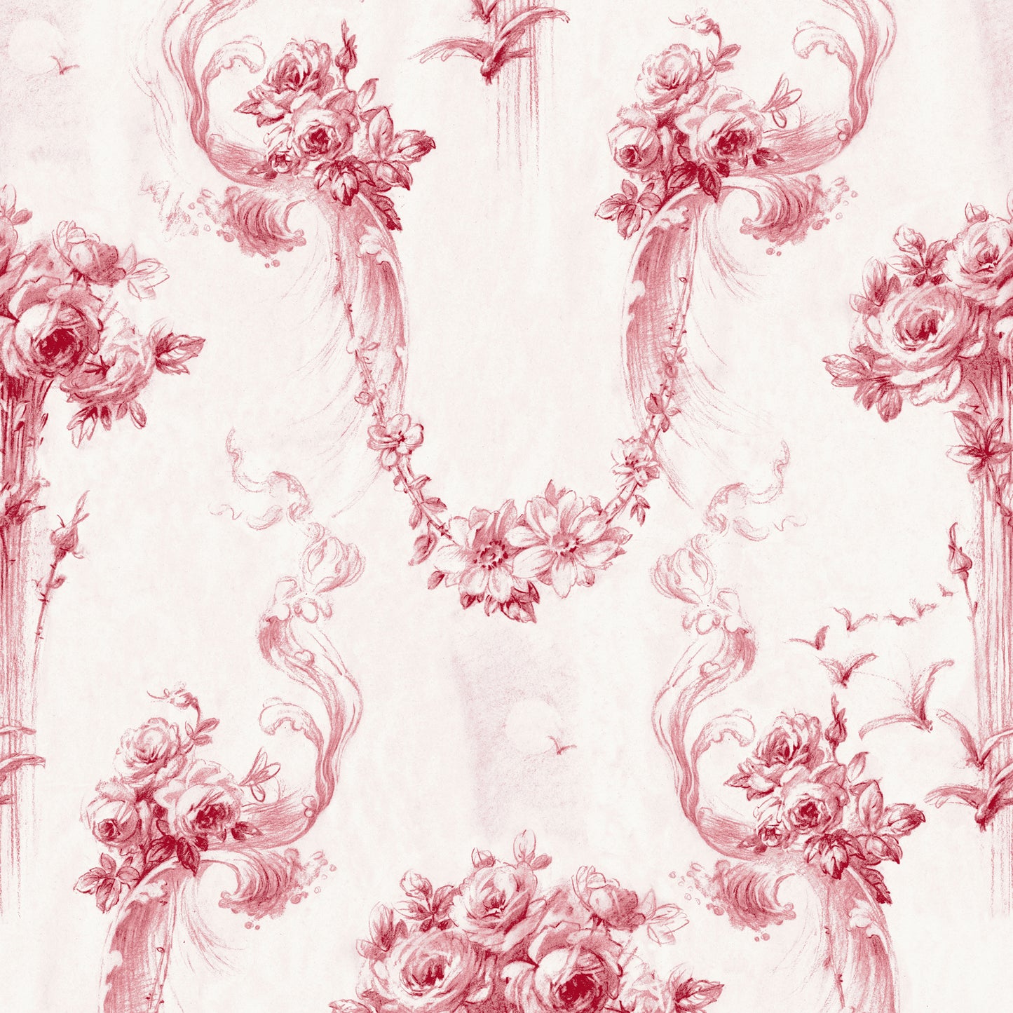 An enchanting, expressively hand sketched baroque design of bouquets, garlands, ribbons and birds. Bathroom or boudoir? Relish the romance!